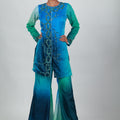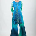 Blue atoll hued honeycomb pattern hand embroidered front open kurta with boot cut pants